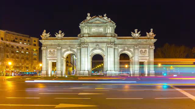 spain madrid night light arch de triumph front traffic panorama 4k time lapse