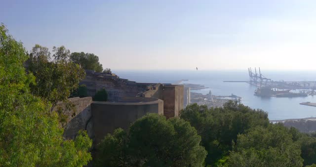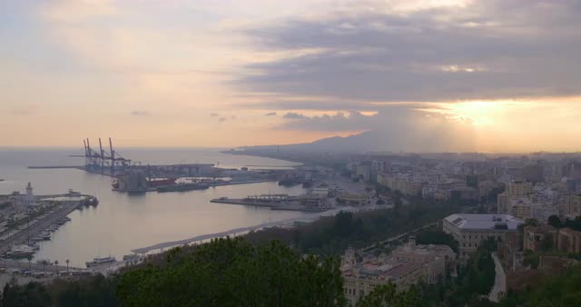 malaga city port crane sunset panorama 4k time lapse spain