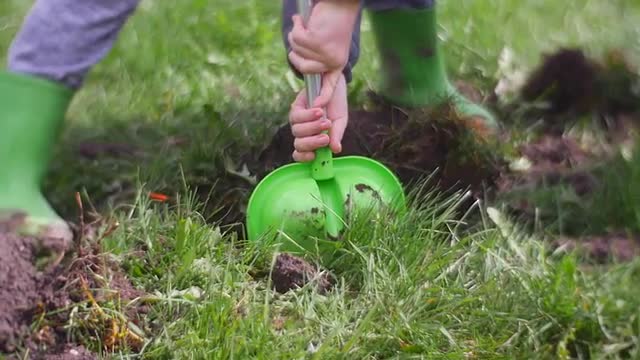 > Boy and Girl Help to Father to Dig a Deepenings in the Ground