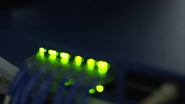 Rack focus of blinking lights in on server where networking cords are plugged in.