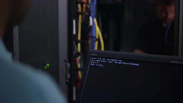 Two men working on network server panning from man to computer screen.