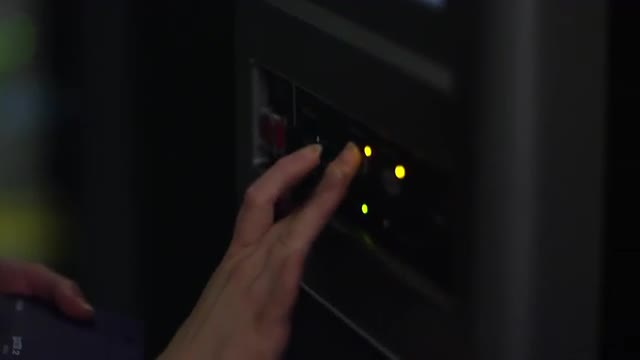 View of woman working on network server as she uses stylus to type on screen