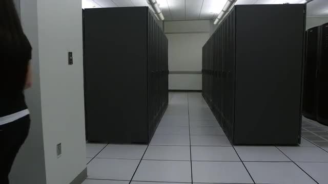 > Dolly shot through network servers as woman passes by