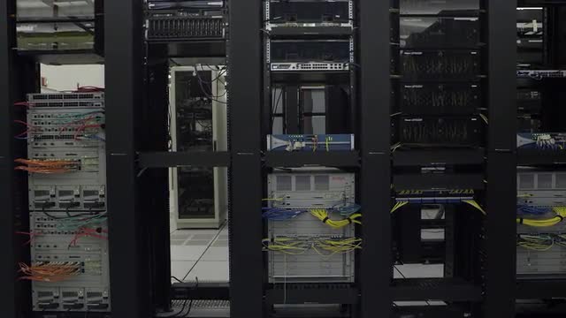 Reverse dolly shot of networking rack