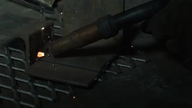 > Slow motion of arc welder shooting hot sparks.
