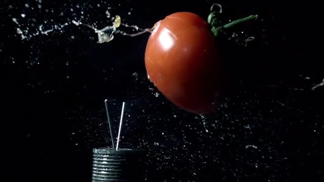 Slow motion of 50 cal. bullet hitting tomato being shot from an airgun.