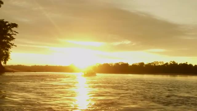 776899 - Front of Blue Boat floating through brown Amazon River, Birds Eye, Osmo 4k