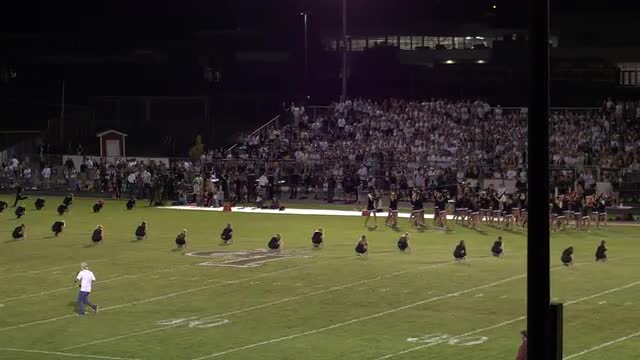 Aerial pan of high school cheerleaders and band performing