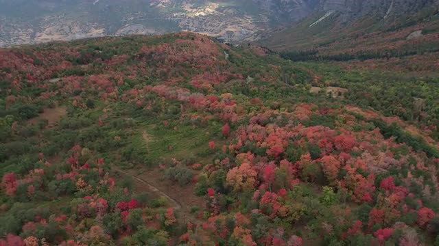 Aerial view flying over trees on hillside showing colorful trees with road winding through the forest.