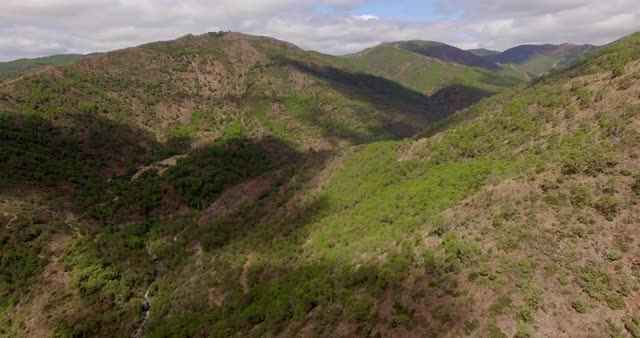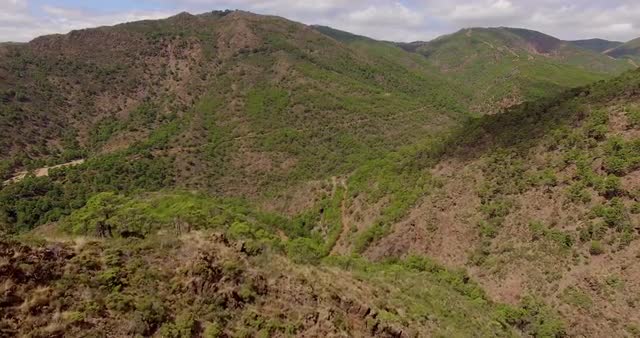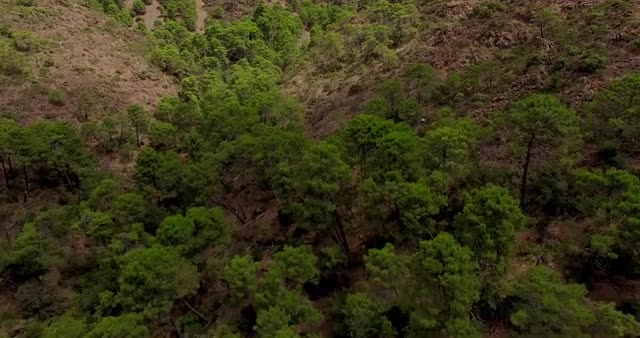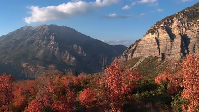 Aerial pan of colorful tree tops in Fall with mountains lit up in the background.