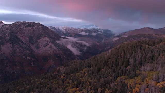 Aerial panning view of a colorful mountainside in the fall at sunset.