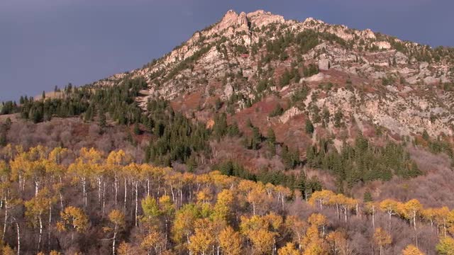 Aerial view of a colorful forest on a mountainside in Utah during the fall.