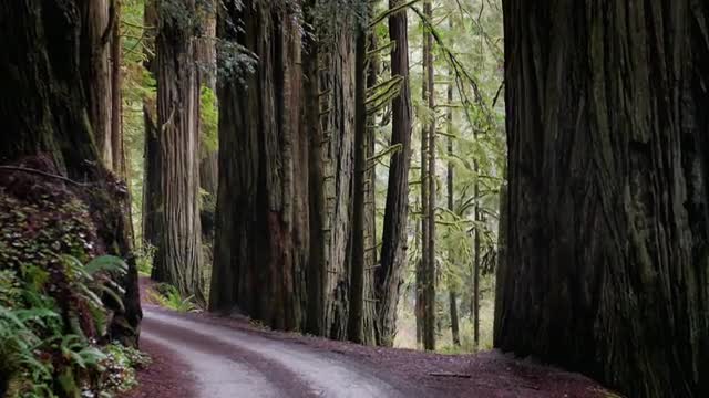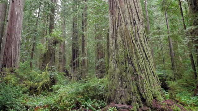 Slider shot moving away from a thick, mossy tree and revealing a beautiful waterfall in Silver Falls State Park, Oregon.