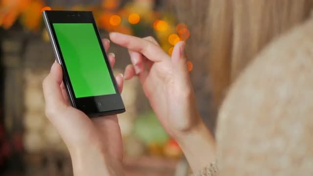 Woman using vertical smartphone with green screen. Close up shot of woman's hands with mobile. Elegant abstract garlands bokeh background