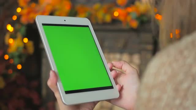 Woman looking at vertical tablet computer with green screen. Close up shot of woman's hands with pad. Elegant abstract garlands bokeh background