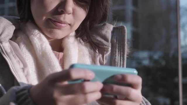 Woman looking at horizontal smartphone with green screen. Close up shot of woman's hands with mobile
