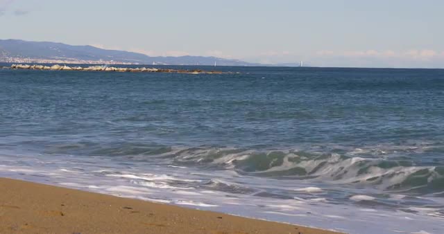 spain barcelona sunny day beach waves panoramic city view 4k