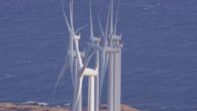 748011 - Aerial shot of windmills on the coast of Hawaii