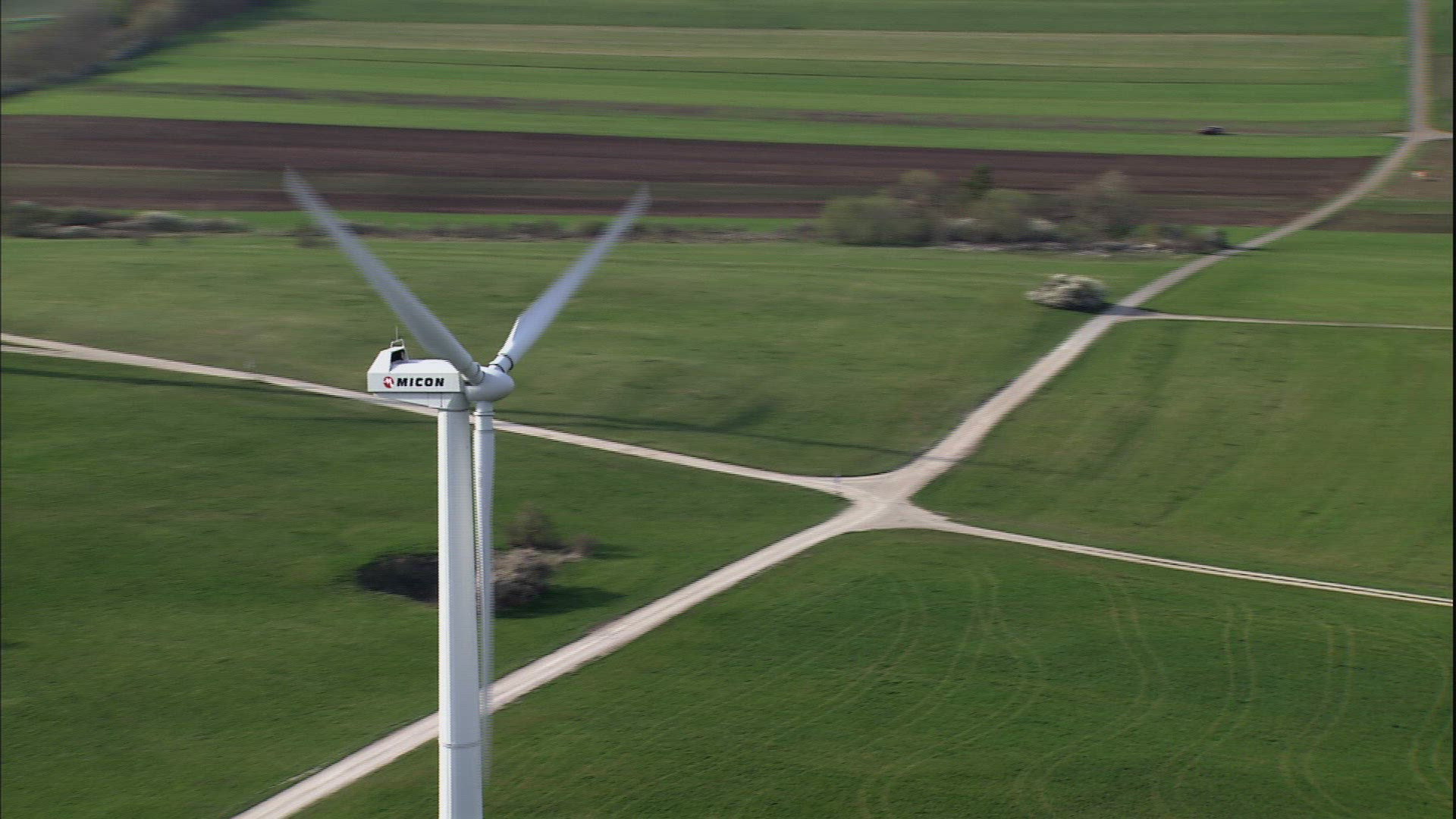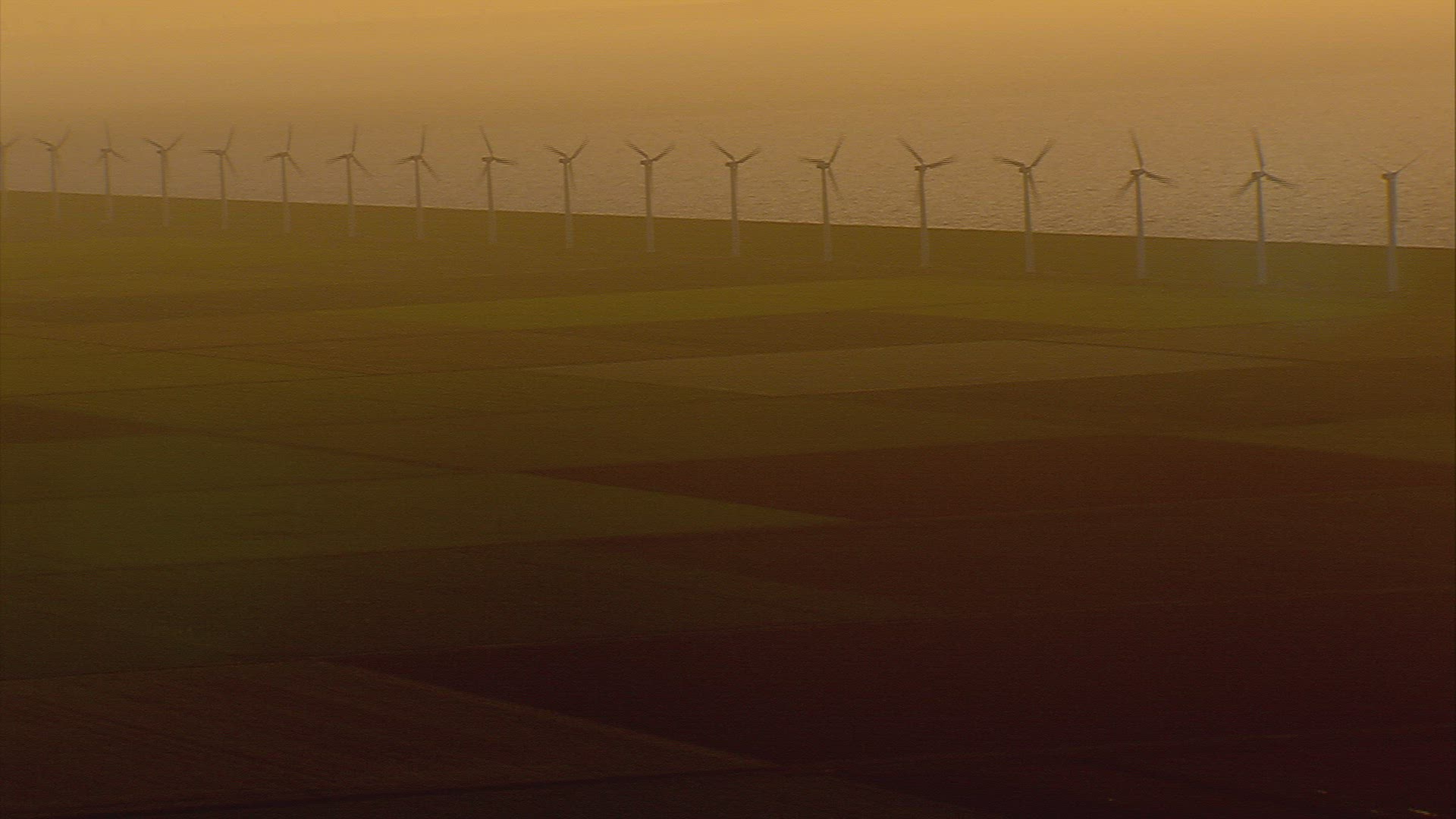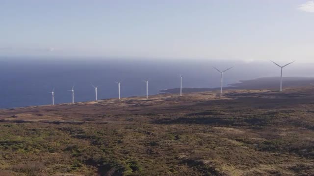 Aerial shot of windmills on the coast of Hawaii with the ocean on the background