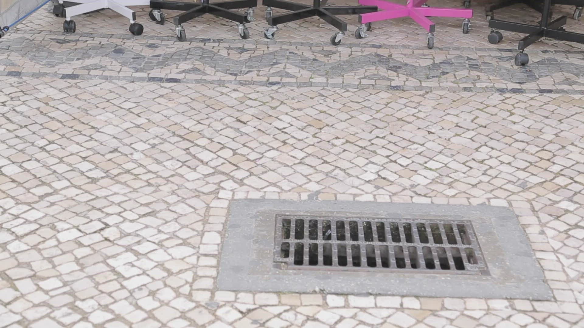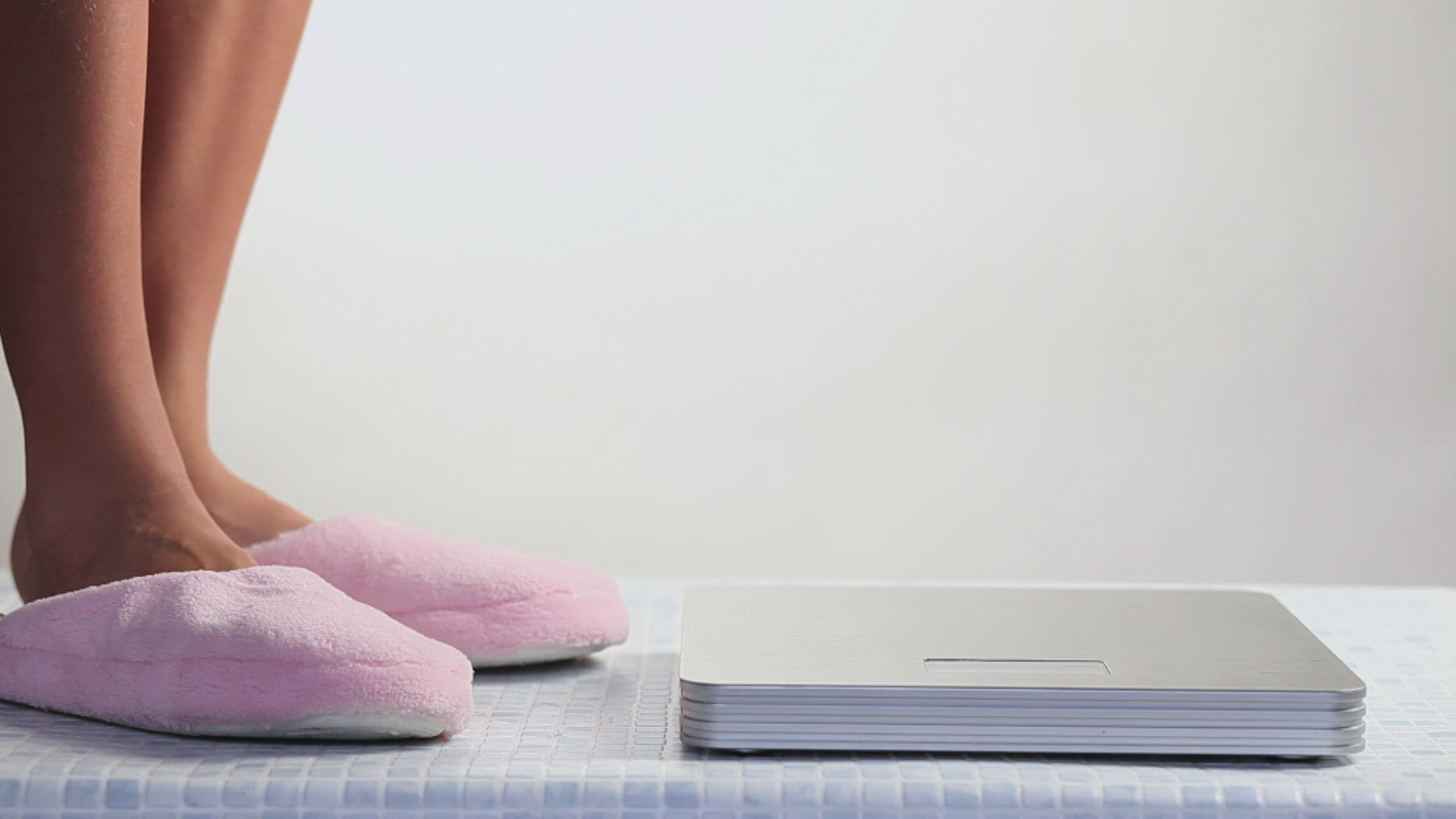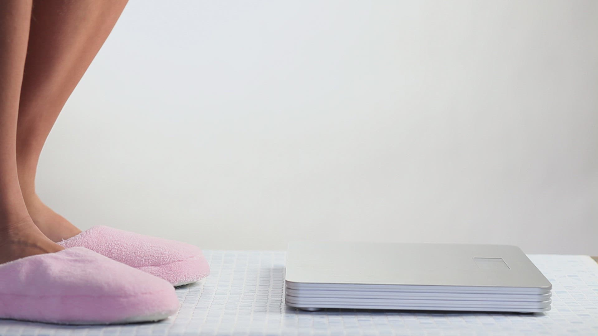 Soft White Slippers on Beautiful Female Burrows. Feet Stand on the Floor on a Carpet With a Pattern of Strips. the Hem of the Dressing Gown Hangs From Above. Slow Motion