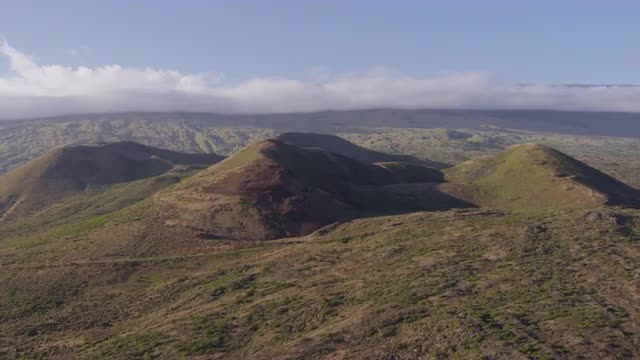 Aerial shot of a windmill on the hilly coast of Hawaii