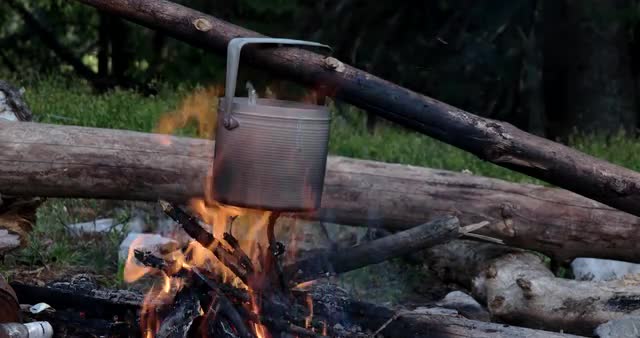 600154 - Boiling Water in a Tourist Pot Above the Fire at Night