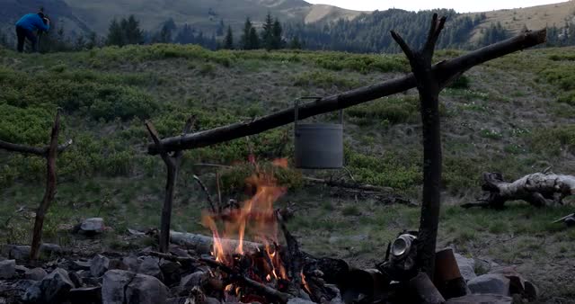 600146 - Boiling Water in a Tourist Pot Above the Fire at Night