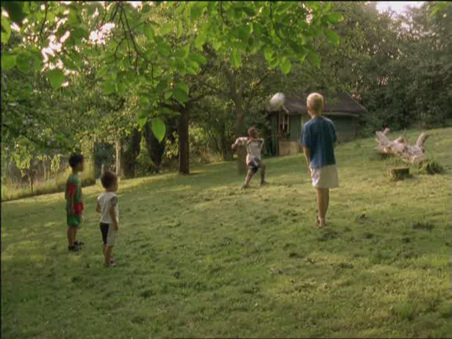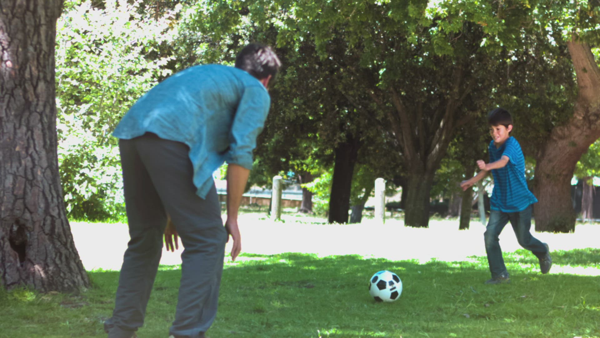 a Boy in a Blue Festive Suit is Standing With His Foot on a Soccer Ball. he Looks Away and Smiles. in the Background a Beautiful Brown Cottage Lit by the Sun. Slow Motion