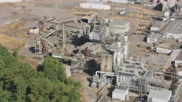 Aerial shot of a old factory chimney in an industrial plant
