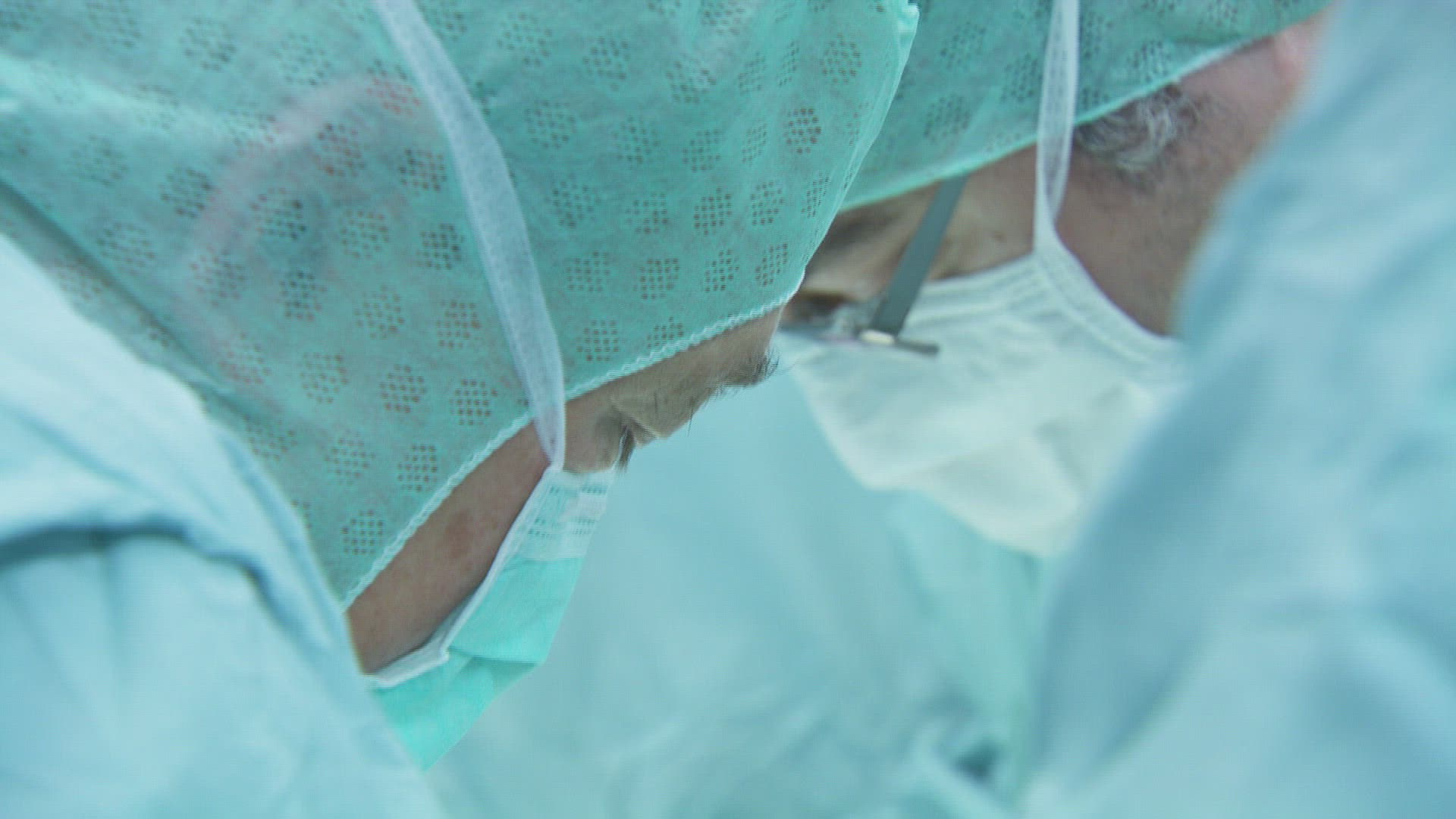 Head shoulders full frame young male Asian surgeon wearing operating mask gown