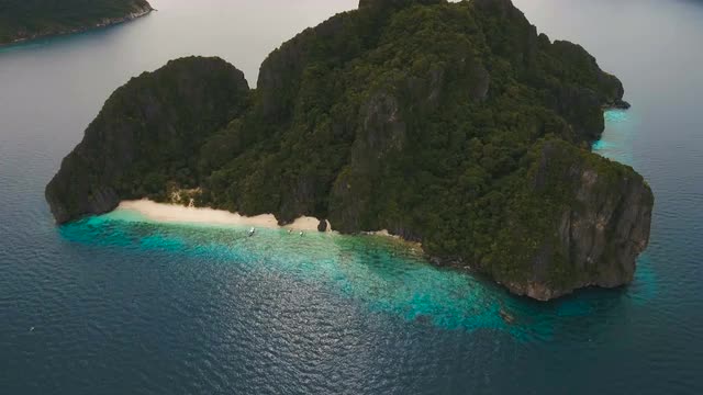 Wild beautiful beach with coconut palms. Tropical bay in El Nido. Aerial view: bay and the tropical island. Aerial video. Sky and mountains rocks. Tropical lagoon with turquoise water and white sand. Seascape: mountains, ocean. Philippines, El Nido. 4K video. Travel concept. Aerial footage.