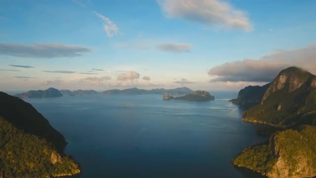Tropical bay in El Nido. Aerial view: bay and the tropical islands. Tropical landscape. Sky and mountains rocks. Aerial video. Seascape:sky, mountains, ocean.Philippines, El Nido. 4K video. Travel concept Aerial footage.