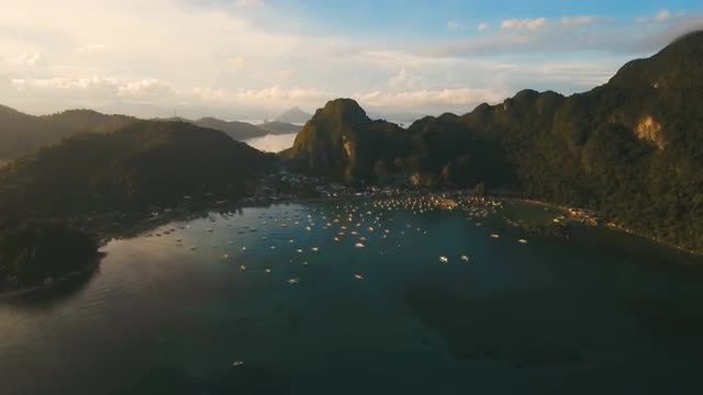 Aerial view of sailing boats and yachts in the bay. Boat and yacht in the tropical lagoon. Aerial view: tropical landscape. Sky and mountains rocks of bay. Aerial video tropical island. Philippines, El Nido. 4K video. Travel concept. Aerial footage.