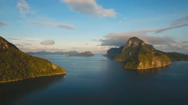 Tropical bay in El Nido. Aerial view: bay and the tropical islands. Tropical landscape. Sky and mountains rocks. Aerial video. Seascape:sky, mountains, ocean.Philippines, El Nido. 4K video. Travel concept Aerial footage.