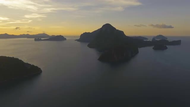 Tropical bay in El Nido sunset. Aerial view: tropical landscape. Sunset sky and mountains rocks of bay. Dreamy sunset among the rocks. Aerial video tropical island.Philippines,El Nido. 4K video. Travel concept. Aerial footage.
