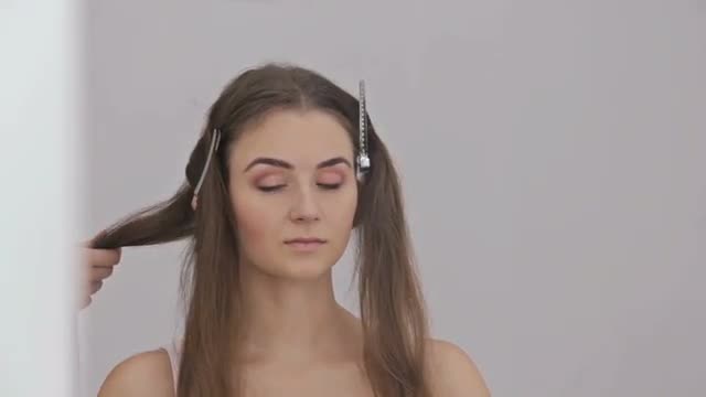 Top knot hair design - hair stylist, hairdresser finishing hairstyle for young pretty woman and using hair spray in white make up room. Beauty and haircare concept