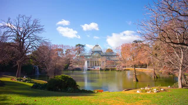 > sunny day pond panoramic view on palacio de cristal 4k time lapse spain