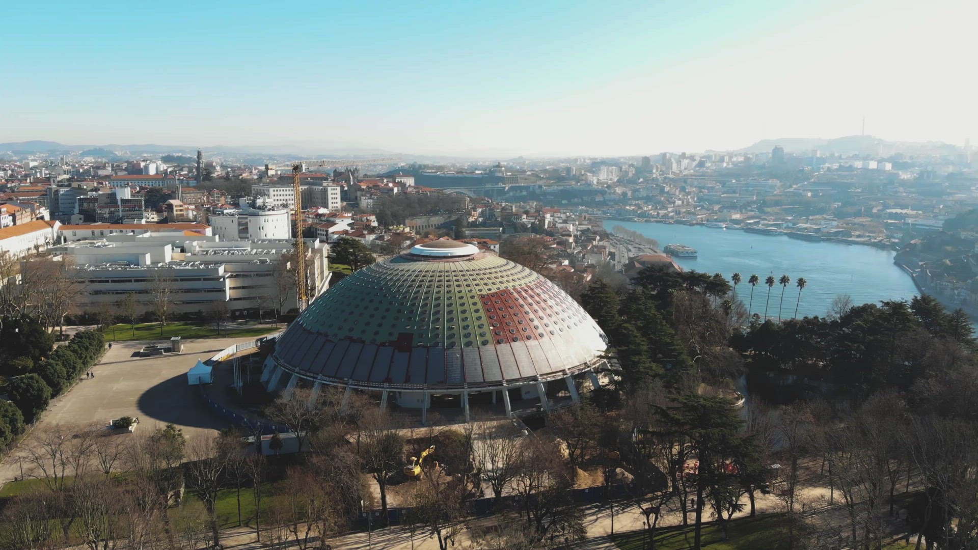 sunny day pond panoramic view on palacio de cristal 4k time lapse spain