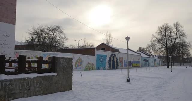 Evening Walk Along Park Alley, Bare Trees' Crowns Silhouettes on a Background of Grey Sky. Roofs of a Houses, Village Street in Winter Day, Outdoors. View Down Up, Camera Goes Around. Konotop, Ukraine. View of Winter Cityscape in Cloudy Frosty Day. Citizens on Christmas Holidays. Small Provincial Town, Quiet City. Blue Hour Shooting, Panorama of Nature. Virtual Evening Walk by the City Streets and Park.