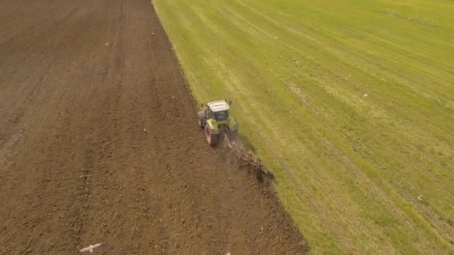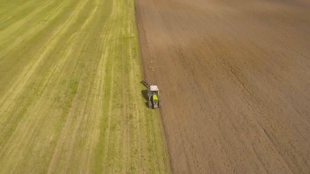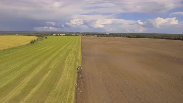 Aerial view:tractor is spraying pesticides on potato field.Aerial video.Aerial view of the tractor spraying the chemicals on the large green fieldTractor spraying a field.Treatment of crops against weeds.4K,UHD.