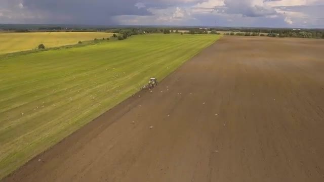 > Tractor is spraying fertilizers potato field.Aerial video.