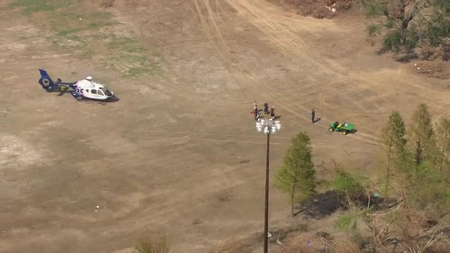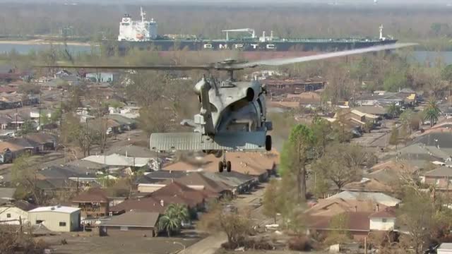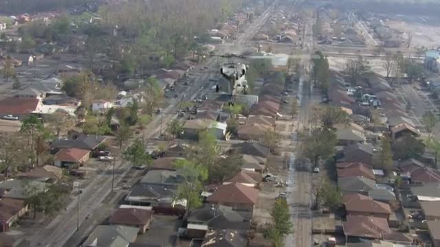> WS POV AERIAL View of life net helicopter hovering over destructed area / United States