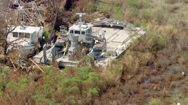 WS POV AERIAL ZO Boats damaged at harbour / United States