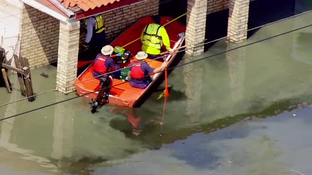 > MS POV AERIAL ZI ZO Rescue workers patrolling on rescue boats in flooded area and checking homes for