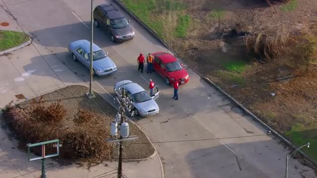 > MS POV AERIAL ZO ZI View of police standing near fire engine / United States
