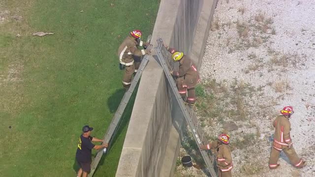 MS POV AERIAL TS ZO Firefighter conducting rescue operation / United States