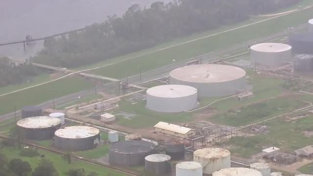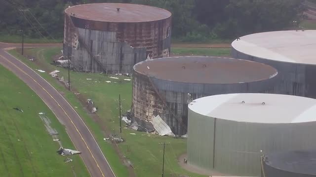> MS POV AERIAL Storage tanks and refineries damaged due to natural disaster / United States