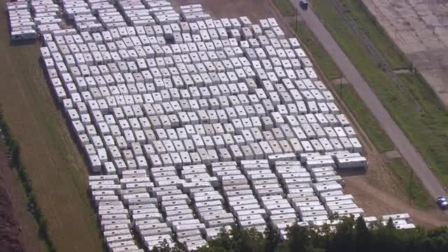 WS POV AERIAL ZI ZO View of trailers and mobile homes / United States