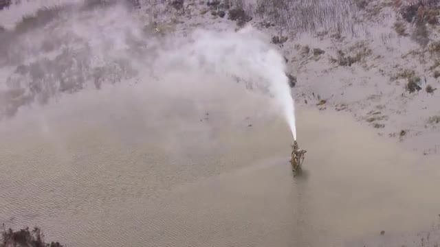 MS POV ZI Ignited gas line breaks bubbling up through water / United States