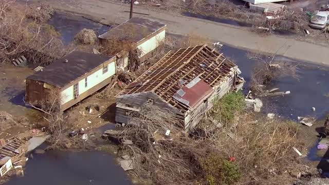 > WS POV AERIAL ZI Community destructed due to floods in river / United States